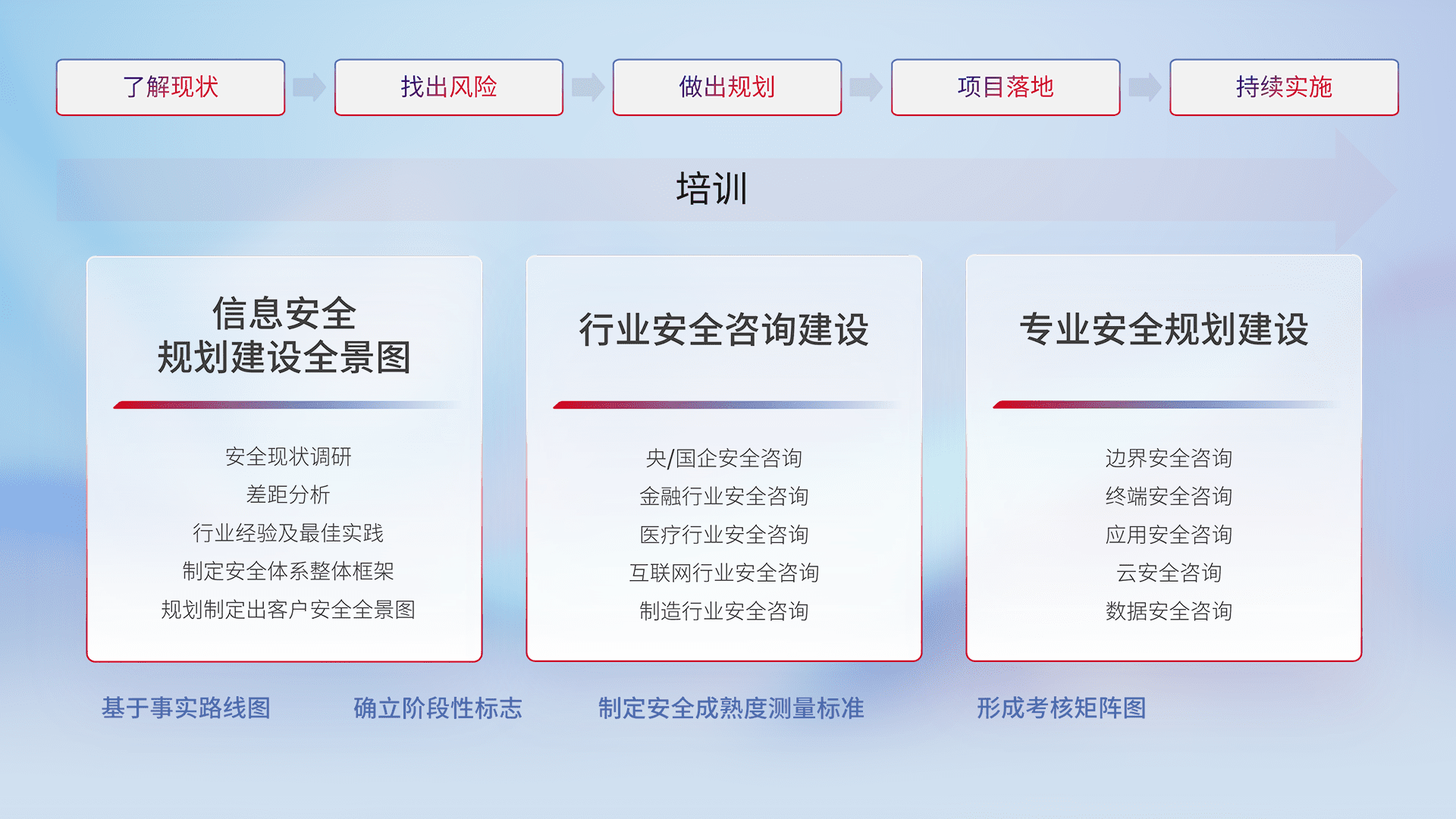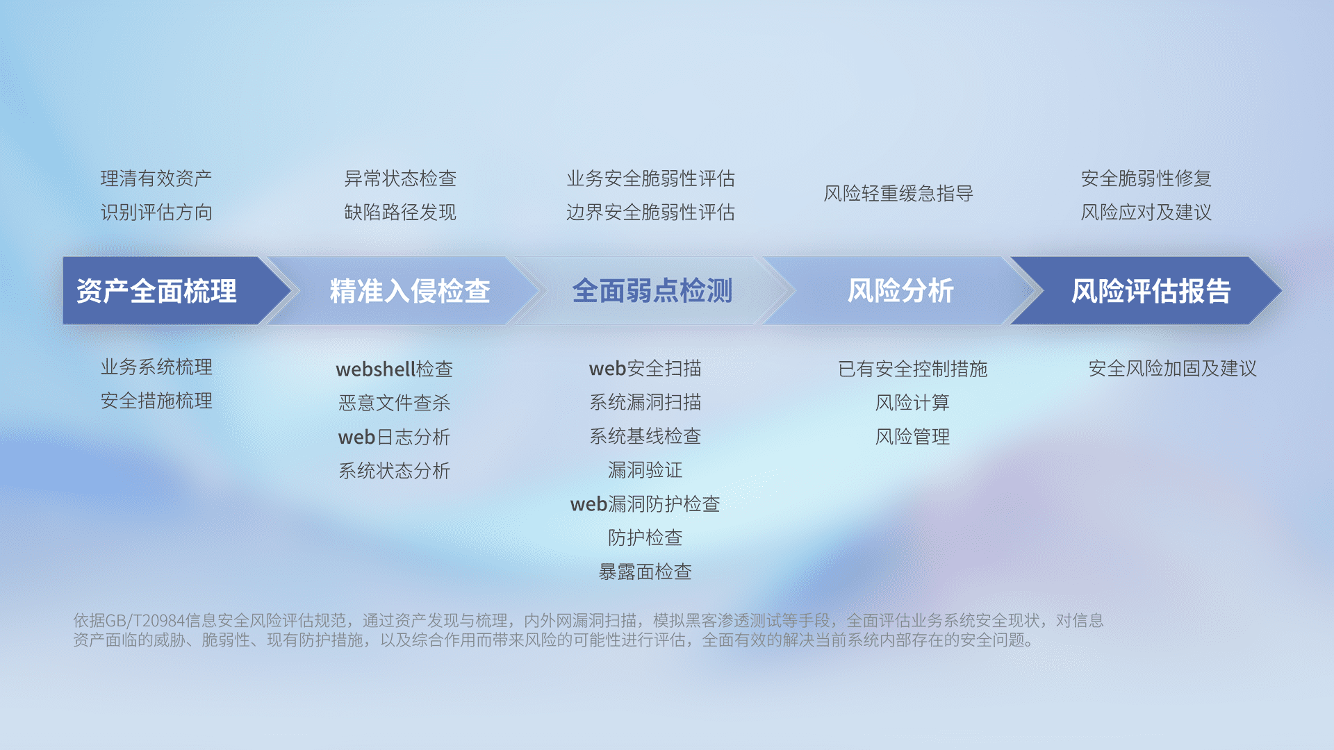 针对客户行业特性,,以专业的安全服务+多厂商联合解决方案提供专属的一站式安全管理服务,,,帮助客户全面感知网络空间威胁,,,,基于识别、、、、检测、、、、分析、、、、防护、、、监测、、、、响应的服务理论模型,,,,从方案咨询、、、、集成交付、、、评估验证、、优化加固、、、、运维运营,,,致力于为客户提供完整的闭环管理式安全服务。。以实战经验为客户打造高抵御风险的安全体系,,,帮助客户发现威胁、、对抗威胁、、、、处置威胁,,,不断积累安全对抗能力,,,持续保障数字化安全。。。