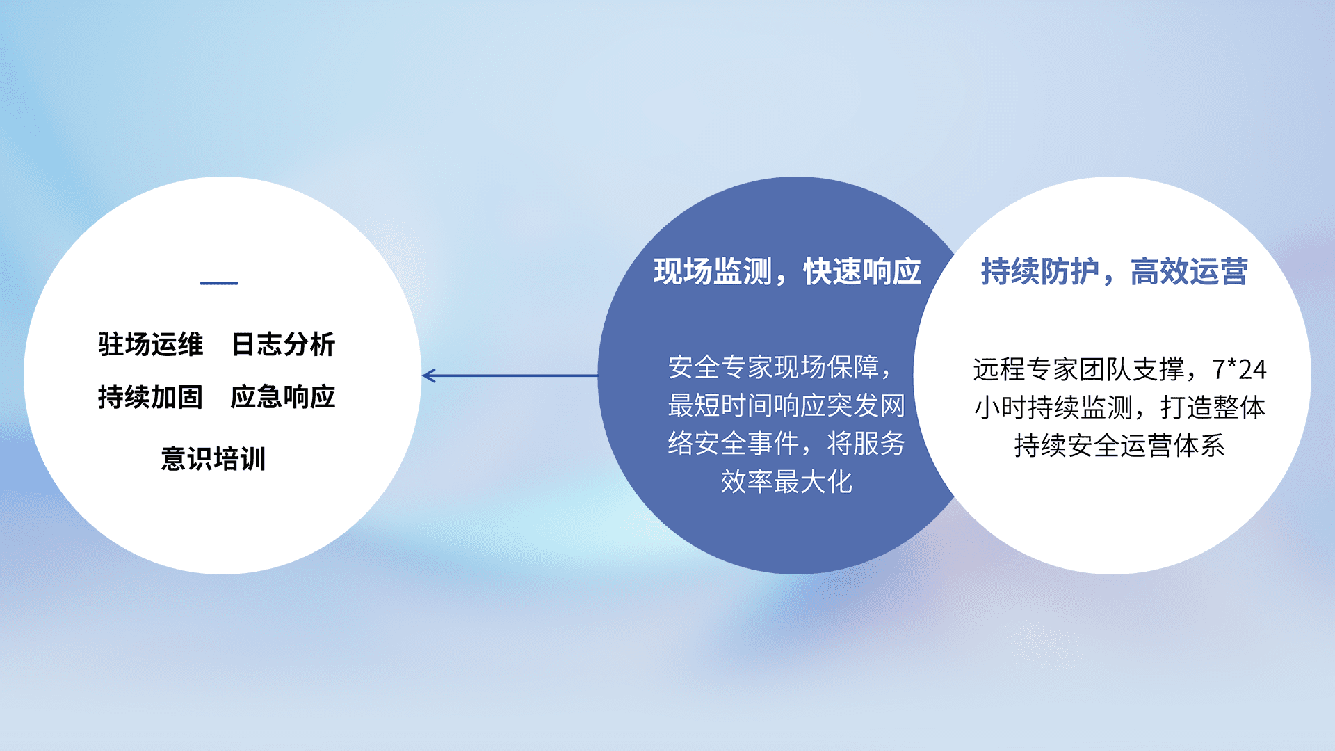 针对客户行业特性,,提供专属的一站式安全管理服务,,帮助客户全面感知网络空间威胁,,,通过安全专家的线上、、、、线下防护支持,,,实现风险闭环,,,将安全保障常态化,,为客户打造常态化安全运维运营服务。。。